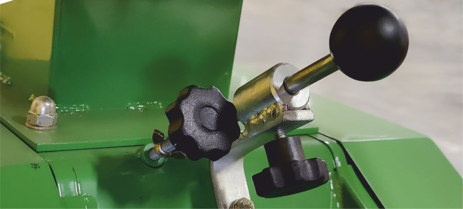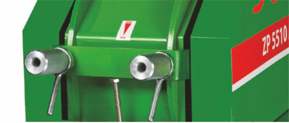 Enkel valsinställning. Med hjälp av de två individuella reglagen kan krossningsgraden ställas steglöst. Efter inställning kan reglagen låsas på ett be- tryggande sätt helt utan verktyg. Justerbart anhåll för enkel återställning. Snabb inställning samt låsning av inmatningsmängd. |