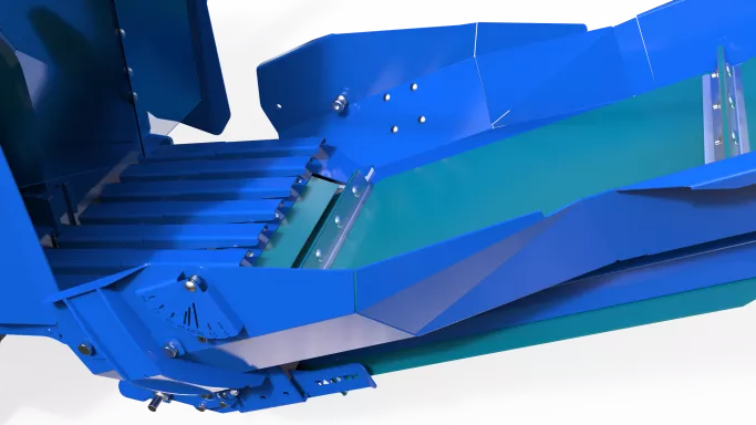 Brett och slitstarkt inmatningsband samt styrklaff som förhindrar att stockar fastnar vid inmatning.